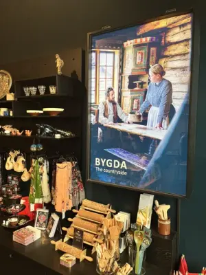 I butikken vår finner du klassisk norsk håndverk og design av høy kvalitet. Vi har historiske glass, dekketøy, keramikk, håndlagde treprodukter, smykker, kniver, skjerf og strikk. Vi fører et bredt utvalg av lokale bøker og fagbøker innen håndverk og husflid. Vi har også egne design basert på trykkblokkene som tilhører museet, og de ulike malte ornamentene man finner i mange hus.