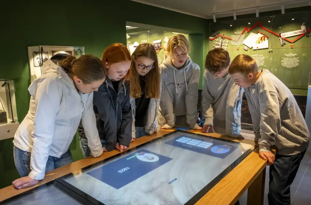 Elever tar økonomiske valg i Trondhjems Sparebanks bankutstilling i museets gamle by. Erik Børseth, Sverresborg Trøndelag Folkemuseum