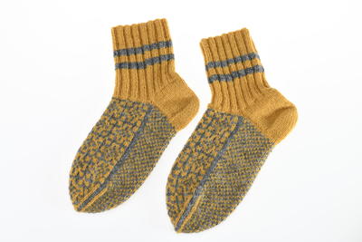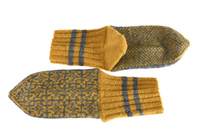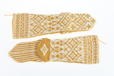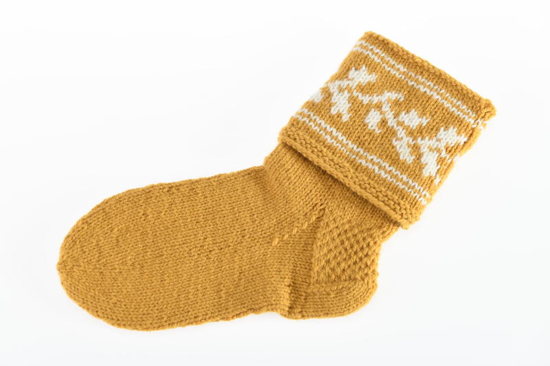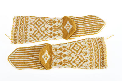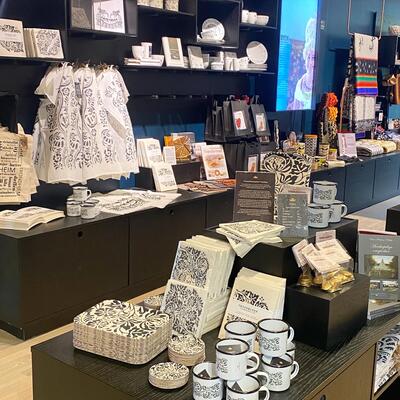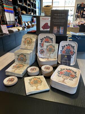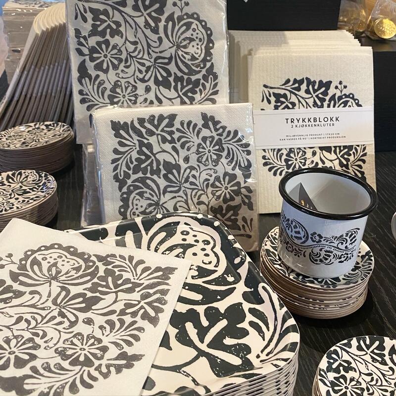 Av utvalgte trykkblokkmønstrene har vi laget en egen kolleksjon av bla. servietter, kjøkkenhåndkle, kluter, emaljekrus og handlenett. Vi har flere strikkepakker med mønster inspirert av trykkbokkene, som er utviklet av museets venneforening.