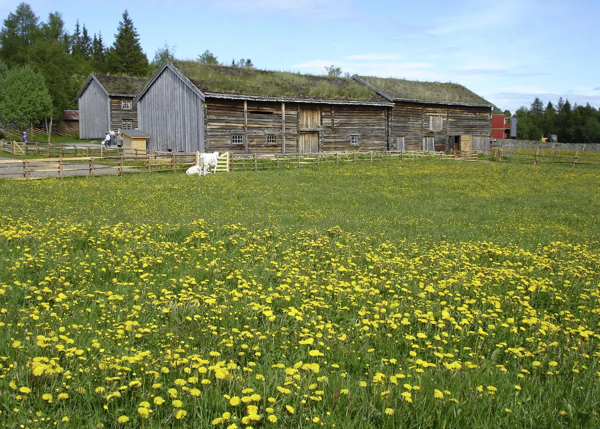Låven og fjøsbygningen er bygd inntil hverandre på en linje. Begge er trolig fra 1800-tallet.