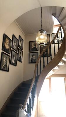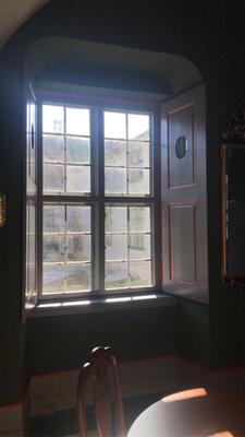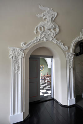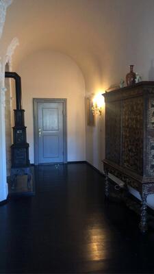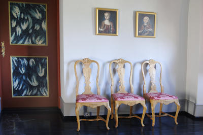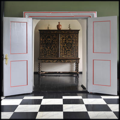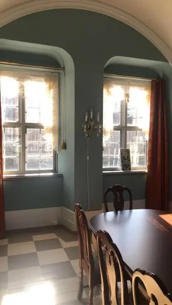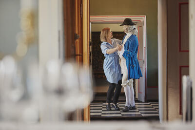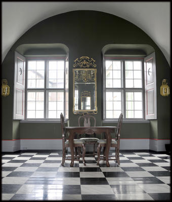 Mikroskopiske spor av maling på dørkarmer har gitt informasjon om fargene som ble brukt i gården. Innredningen består både av noe autentisk gjenstandsmateriale fra den aktuelle tidsepoken, samt kopier og rekonstruksjoner tilpasset bruken av rommene. De antikvariske gjenstandene kommer hovedsakelig fra museets samlinger.