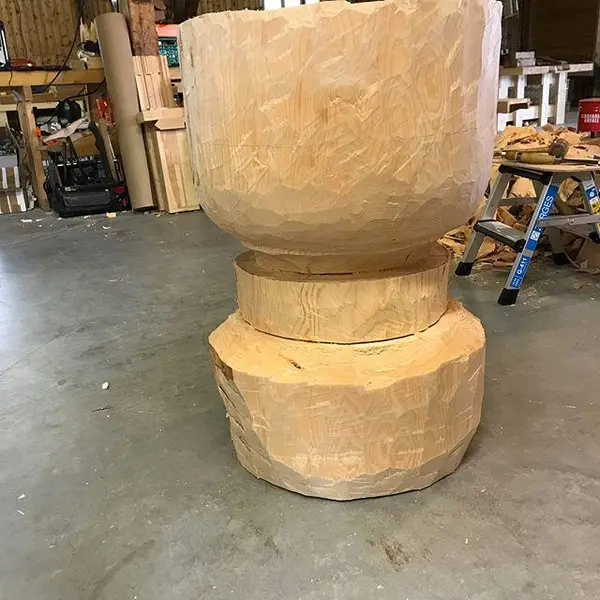 Fonten kan ikke garanteres mot tørkesprekker i treverket, dessverre. Noe så godt som samtlige gjenværende trefonter også bærer preg av. Langsom og skånsom tørk av materialene er nødvendig for å unngå tørkesprekker. For å unngå dette så langt som det er mulig vil jeg borre ut margen av stokken slik at det blir et lite hull tvers gjennom midten. De gamle døpefontene har alle uttappingshull, eller i så fall så er alle de gjennomgående hullene tolket som sådan. På denne måten blir det ingen avvik i forhold til originalene med det gjennomgående hullet. Videre planlegger jeg å hule ut så mye som mulig av stokken både oppe og nede i håp om at det kan bidra til mindre sprekker.