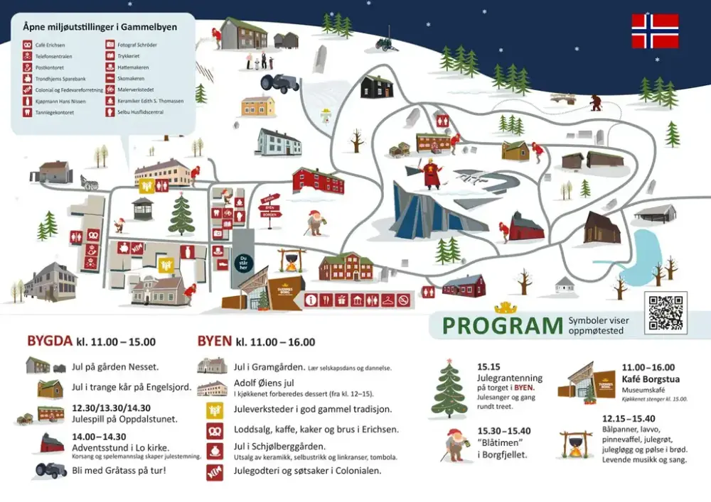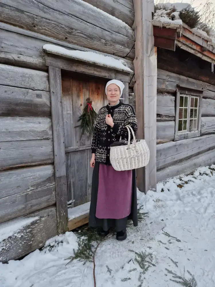 Museets mange historiske bygg pyntes til jul slik det ville sett ut etter datidens standard. På bygd og i by, hos rik og hos fattig. Gå rundt i alle våre åpne miljøutstillinger, eller bli med på omvisninger. Fine familieaktiviteter i juleverkstedene og julespill på Oppdalstunet. Levende musikk på festplassen, og adventsstund i Lo kirke. Borgstua selger julegrøt, gløgg og pølser i brød. Venneforeningen har kafe og loddsalg i Erichsen. Tombola i Schjølberggården. Pinnevaffeldama selger de deiligste vafler som bare må smakes! Vi tenner julegrana og går rundt treet til de kjente norske julesangene hver dag, og avslutter med den magiske Blåtimen som ringes inn i fjellet.