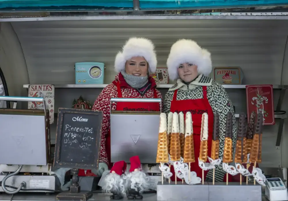 Salg av pinnevaffel, julegrøt, julegløgg og pølse i brød. Levende musikk og sang. Akebrett finner du i boden.