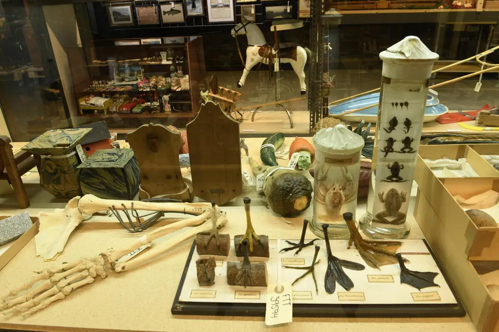 Gjenstandene i samlingen spenner nærmere 1000 år i tid. Fra 1000-tallet til 2000-tallet. Samlingen er svært variert i omfang, fra hele bygninger og skip til småobjekter som smykker og leker. Bildet viser et utvalg fra skolesamlingen museet innehar. FOTO: DINO MAKRIDIS