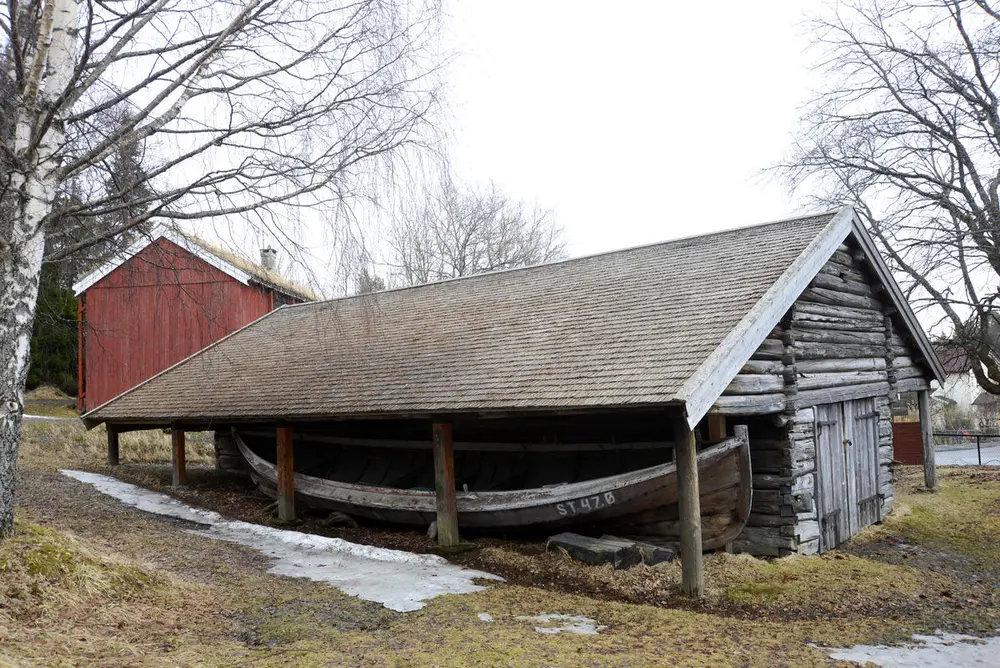 Storbåtnaust, fra 1800-tallet. Fra Østre Fløan i Skatval, Stjørdal, Nord-Trøndelag. Gjenreist på Sverresborg 1958.