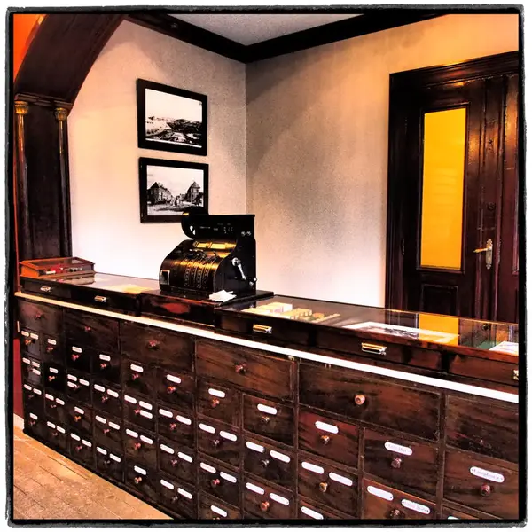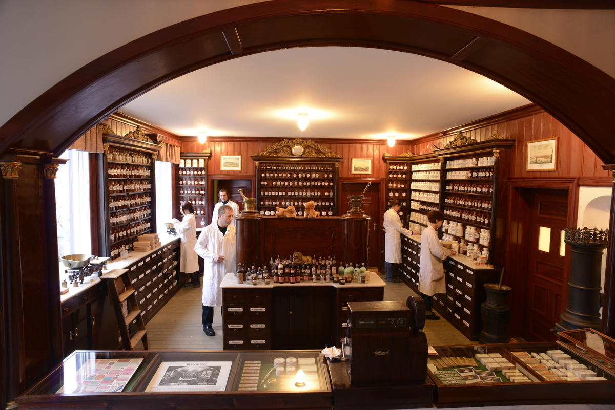 Deler av anlegget går tilbake til 1708, men store forandringer i 1770 og 1834 har gitt det nåværende utseendet. Sto i Kongens gate 6, Trondheim. Gjenreist på Sverresborg 1938-39. Det er apoteket fra 1936 vi viser i Gamlebyen på Sverresborg.