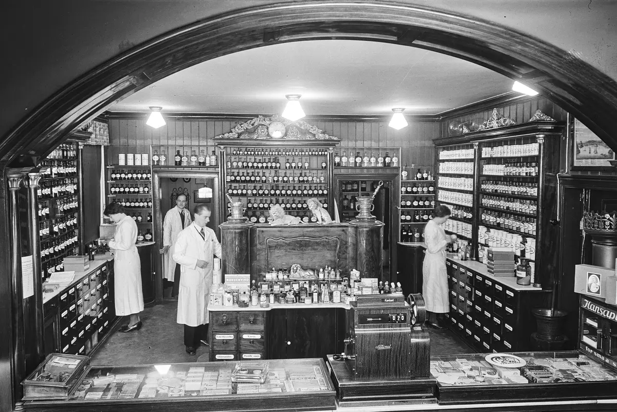 Apotekbygningen var nettopp gjenreist da krigen kom til Norge i 1940. Under tysk militær ledelse ble huset tatt i bruk til offiserskaserne, og store endringer ble gjort innvendig.