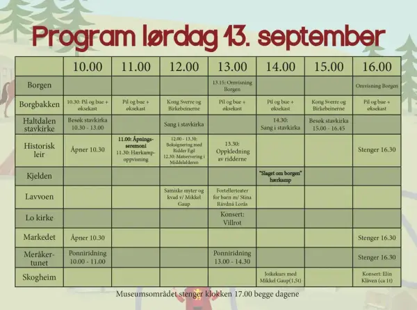 Festivalen blir en fantastisk tidsreise tilbake til middelalderen, med aktiviteter og opplevelser tilpasset alle aldersgrupper. Spennende aktiviteter for hele familien; lassokasting, birkebeinertrening, fortellerteater, ponniridning, hærkamp, omvisninger og konserter. For å nevne bare noe.