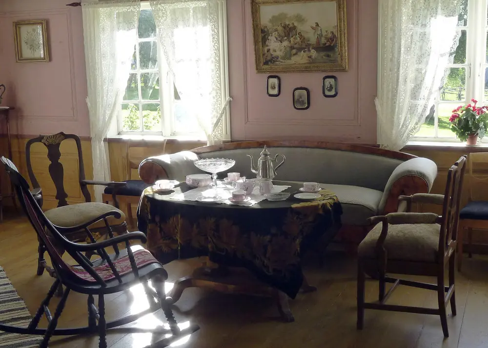 I dag ser huset stort sett ut som det gjorde i 1910, med fine pilaster-paneler i stuene og kammerset. Nystua har originalmaling på veggene og gulvet.