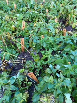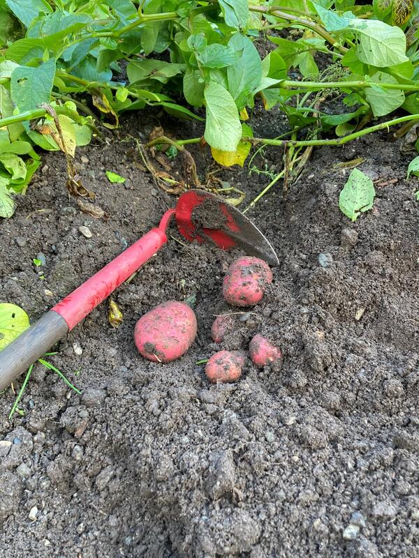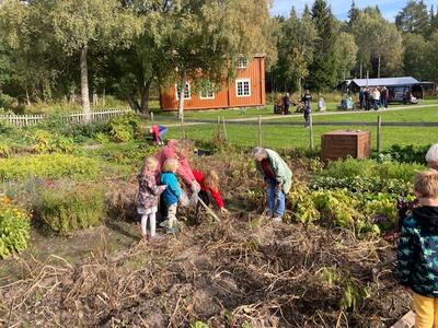 "Skal vi grave i jorda og se hva som har skjedd med potetene vi satte i vår? Velkommen tilbake med potetposene deres og let i åkeren! Kanskje det blir noe i posen å ta med hjem.