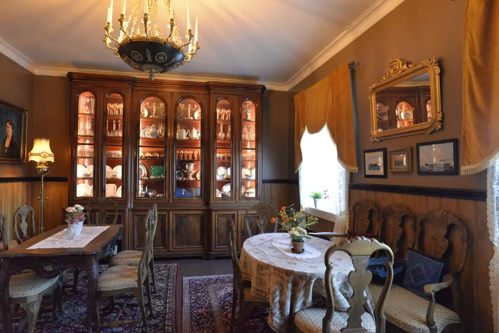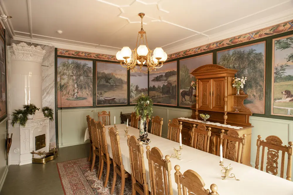 Gjennom døren i nordre vegg kommer man inn i det mørke herreværelset, møblert med Adolf Øiens møbler fra Biljardstabburet på Midtsand gård på Malvik.