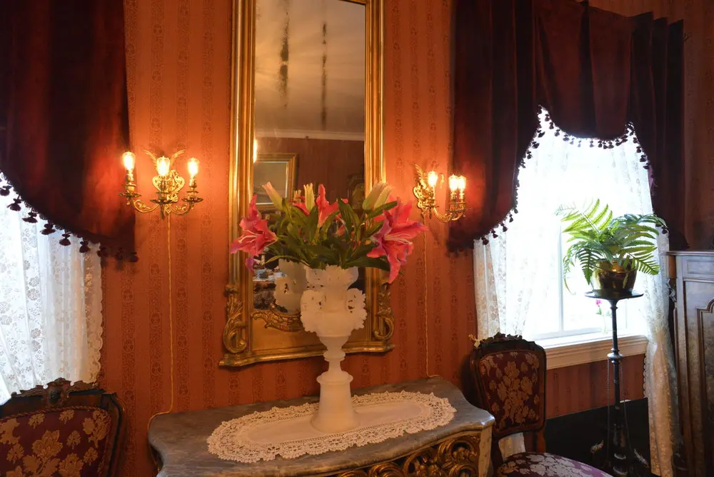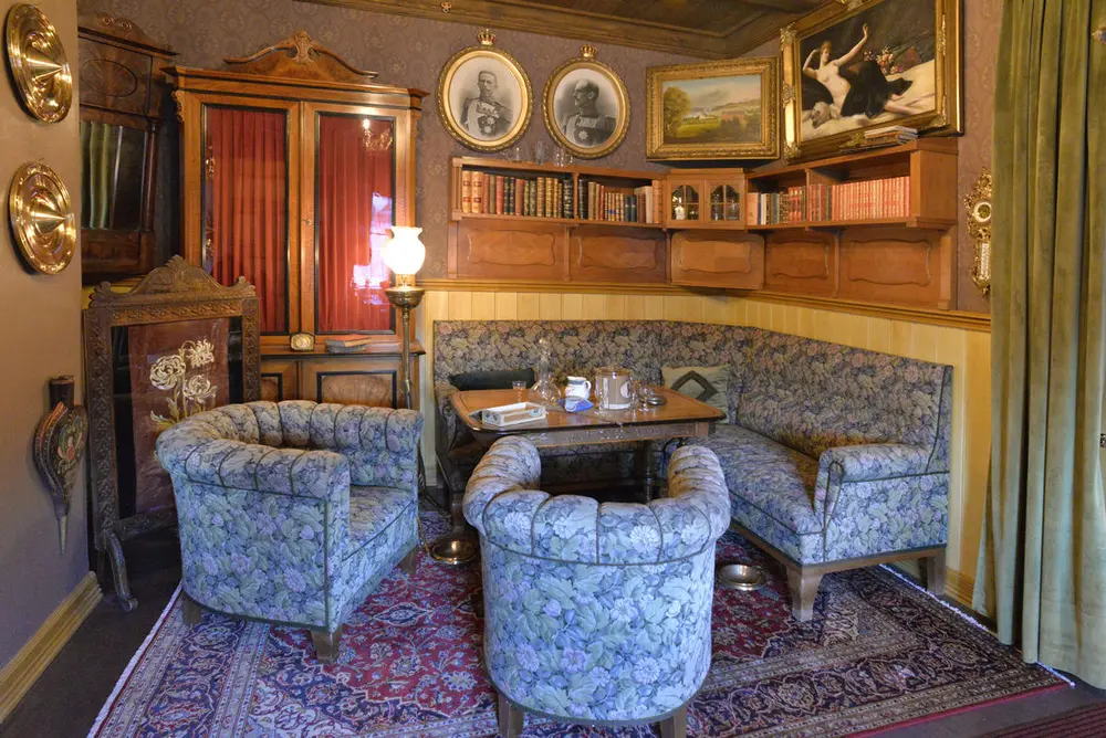 Derfra fortsetter den besøkende inn i den overmøblerte dagligstuen. Her finnes blant annet husets mekaniske piano.