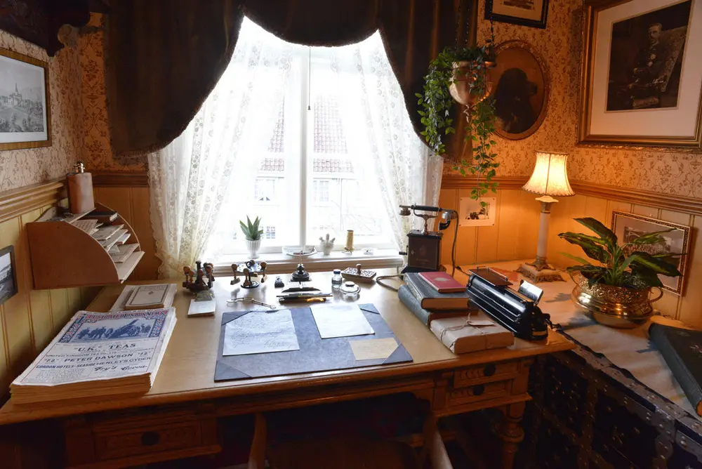 Herfra fortsetter man inn i Øiens kontor, som er møblert med gjenstander som forteller at dette er et arbeidsværelse.