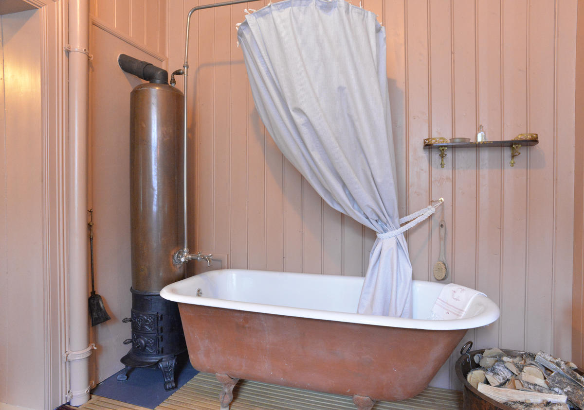 Herfra fortsetter man gjennom badeværelset. Dette har vedfyrt varmtvannsbereder, men ikke noe toalett, da dette alltid lå bak kjøkkenet.