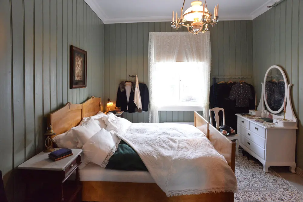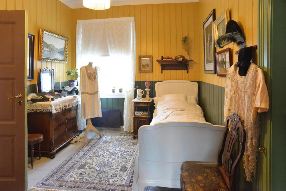Fra badet kommer man inn i Charlotte Øiens værelse. Derfra vender man tilbake til salongen.