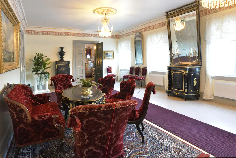 Deretter fortsetter man inn i en brukssalong med møbler som kan benyttes av gjester. Her finnes også et stort skap hvor det stilles ut serviser, bestikk, keramikk, glass og mindre gjenstander.