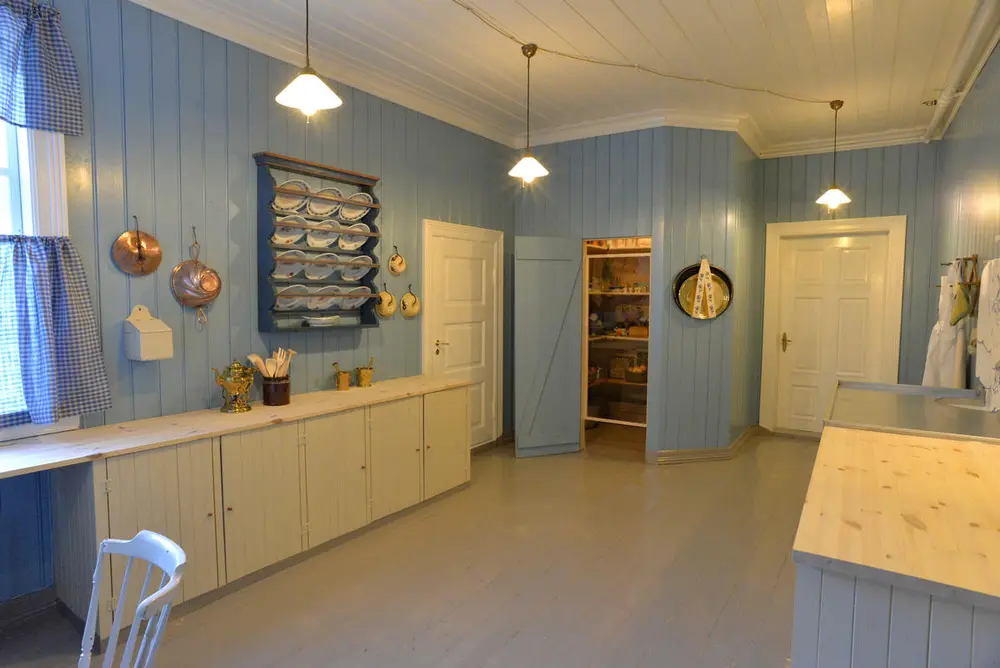 Gjennom en tapetdør kommer den besøkende inn i kjøkkenavdelingen. Denne er innredet ved at den opprinnelige rominndelingen er gjenskapt. Det er laget ny kjøkkeninnredning som er en kopi av en gammel. I kjøkkenbenken finnes varmeplater, komfyr, kjøleskap og oppvaskmaskin, slik at kjøkkenet kan benyttes ved selskapelighet i spisestuen.