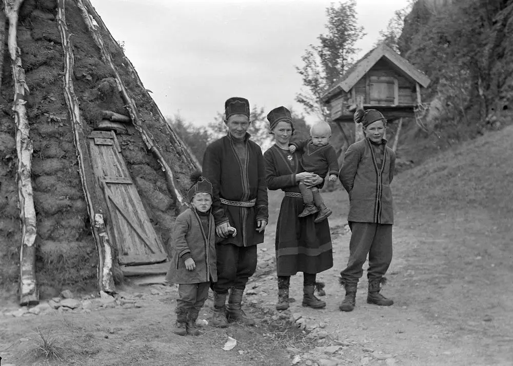 Matheus Mortensson og hans familie i den samiske avdelingen på Sverresborg Trøndelag folkemuseum i 1935.